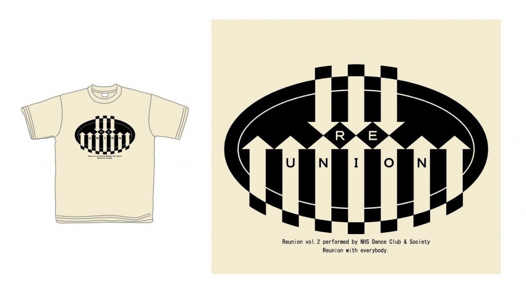 かっこいい感じの「Reunion」文字。そしてその上に、内側からちょっとずつ長くなり、いくつも重なって大きく広がっていく渦。Reunion、ひいてはダンス部や愛好会の繁栄を願ったデザイン。
